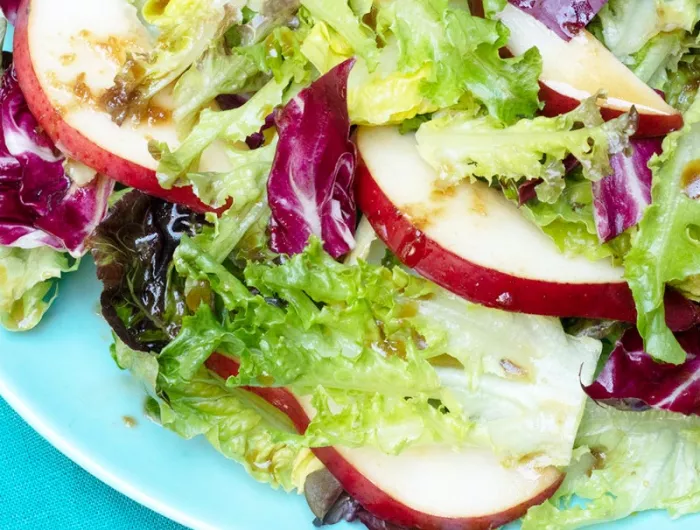 Whisk together 2 tsp. rice vinegar, 1 Tbs. reduced-sodium soy sauce, 1 tsp. grated ginger, 1 tsp. toasted sesame oil, and ¼ tsp. honey. Spoon over 8 cups salad greens and 1 sliced pear. Serves 4.Photo: Kate Sherwood/CSPI.