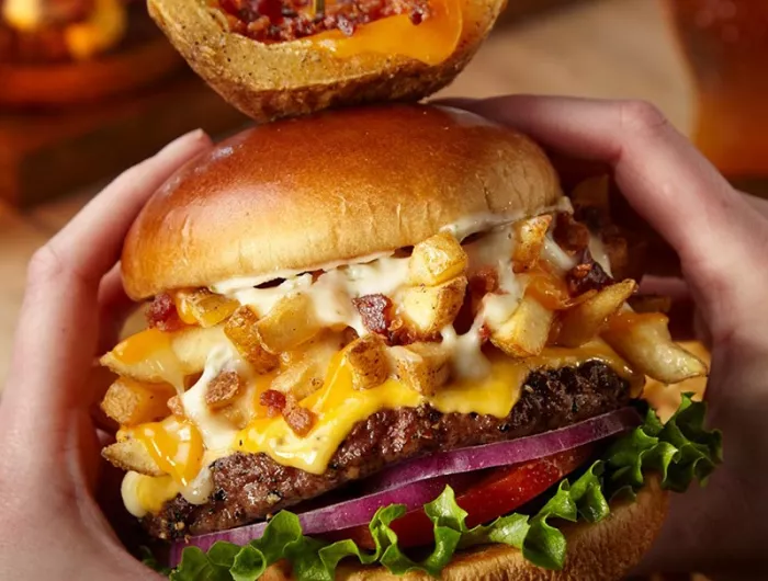 “American cheese, lettuce, tomato, red onions, pickles, piled high with loaded bacon-cheese fries & poblano queso. Skewered with our famous loaded potato skin.”