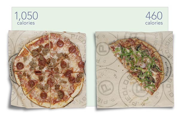 At Pieology, a Mad to Meat You pizza (pepperoni, sausage, meatballs, mozzarella, red sauce) will set you back 1,050 calories. But you can get down below 500 by eating half of the right Custom pie. Ours had red sauce, mozzarella, mushrooms, green bell peppers, red onions, and fresh basil on a whole wheat crust (Pieology won’t say what percentage is whole).