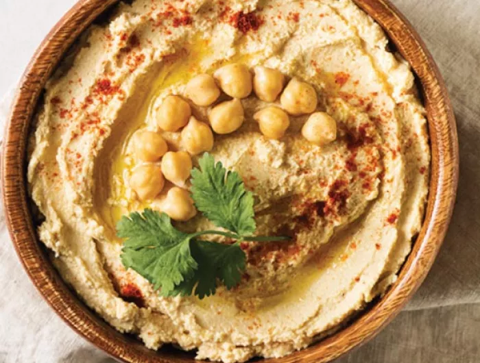 Hummus. Don’t confuse hummus with chickpeas. The hummus’s tahini and oil crowd out some of the beans. A two-tablespoon serving of hummus (70 calories) has just 1 to 2 grams of protein and fiber. A half-cup serving of chickpeas (130 calories) has about 6 grams of each.